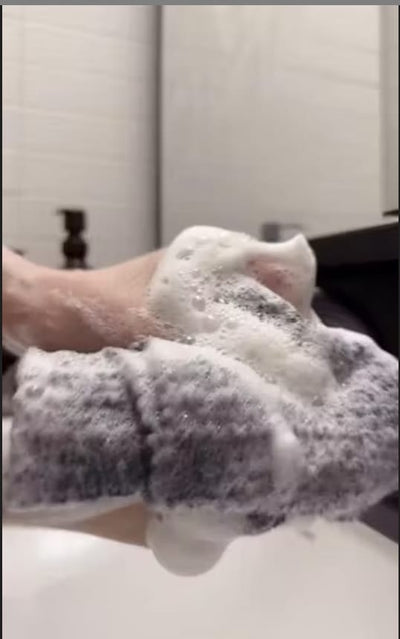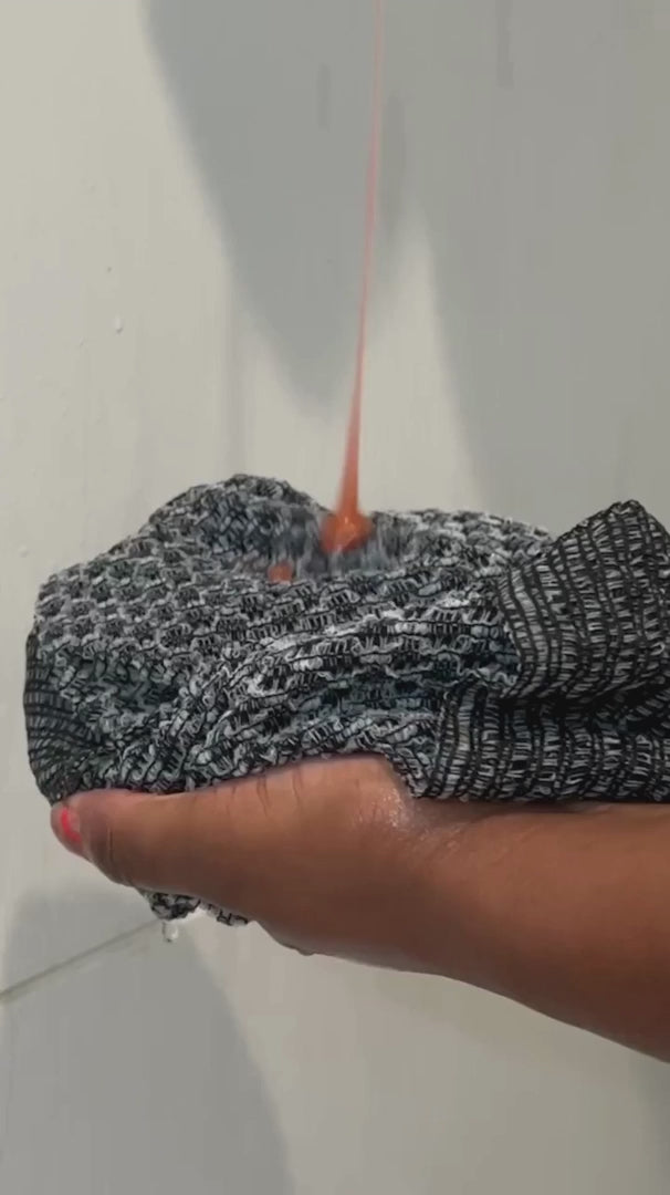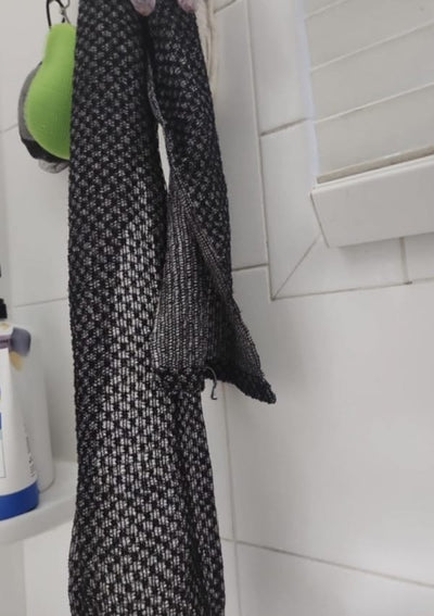 Nach der Dusche genügt es, das Tuch gründlich auszuspülen, Seifenreste zu entfernen und zum Trocknen aufzuhängen. Es kann sowohl mit als auch ohne Duschgel verwendet werden.
