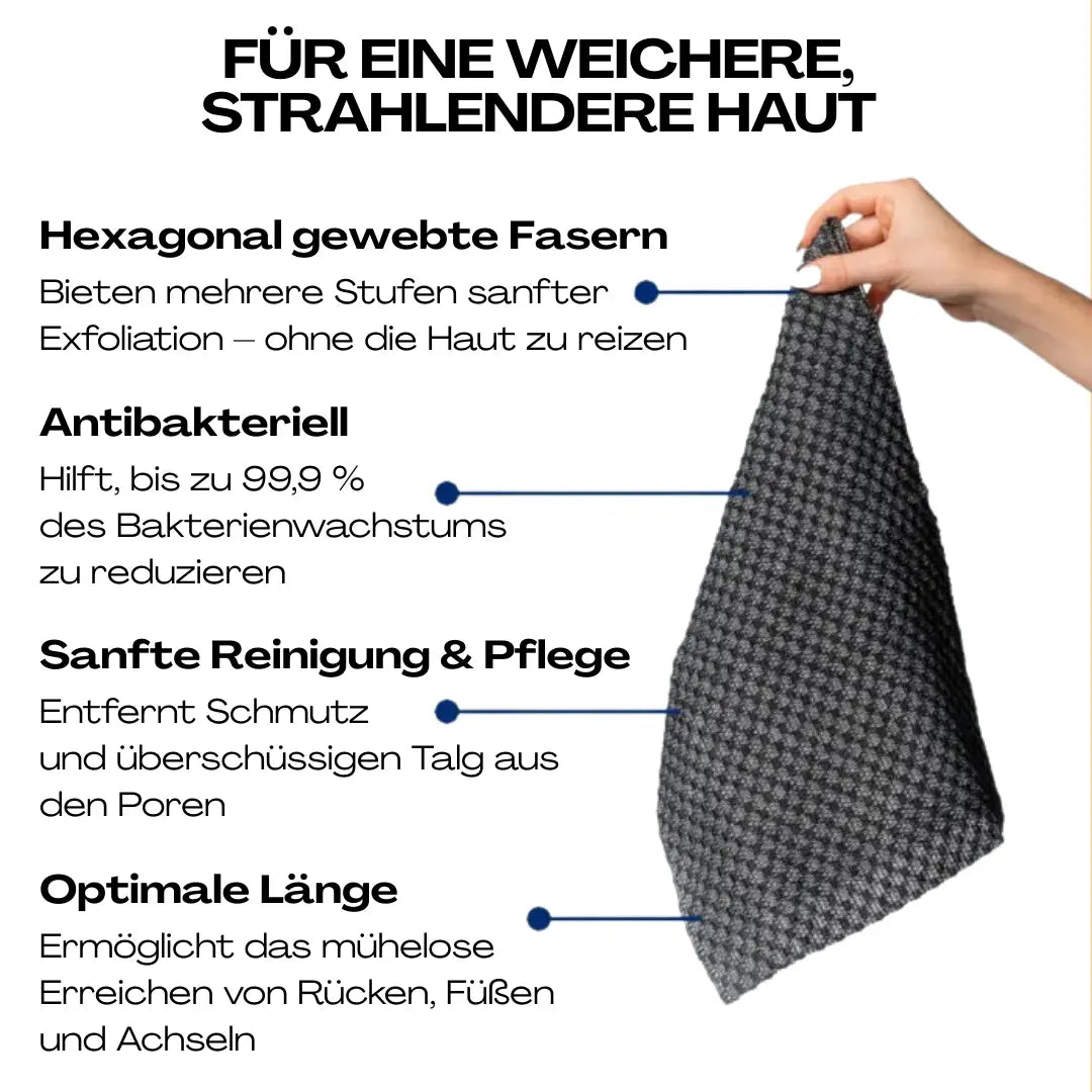 Das PeelingTuch setzt auf ein mechanisches, kontrollierbares Peeling durch spezielle Fasern im Hexagon-Muster. Der Druck lässt sich individuell anpassen, wodurch das Peeling sanft zur Haut bleibt. Besonders für Rücken und Körper sowie für schwer erreichbare Stellen ist diese Methode alltagstauglich und unkompliziert.