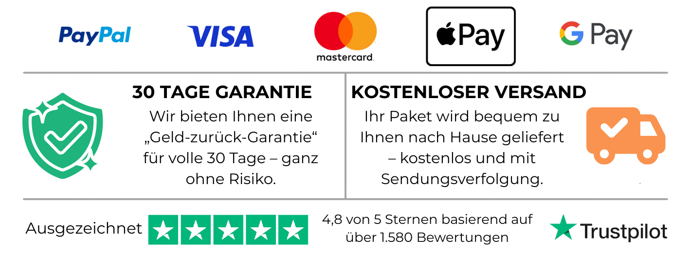 Der Versand ist für dich kostenlos und erfolgt selbstverständlich mit Sendungsverfolgung. Deine Bestellung wird in der Regel innerhalb von 24 bis 72 Stunden für den Versand vorbereitet.